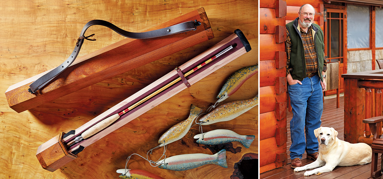 Bill Fleming’s sapele-and-cedar cases are custom-fit to each rod. His dog, Buck, has been accompanying him to his shop since Fleming first brought him home in 2013. photograph by Stacey Van Berkel