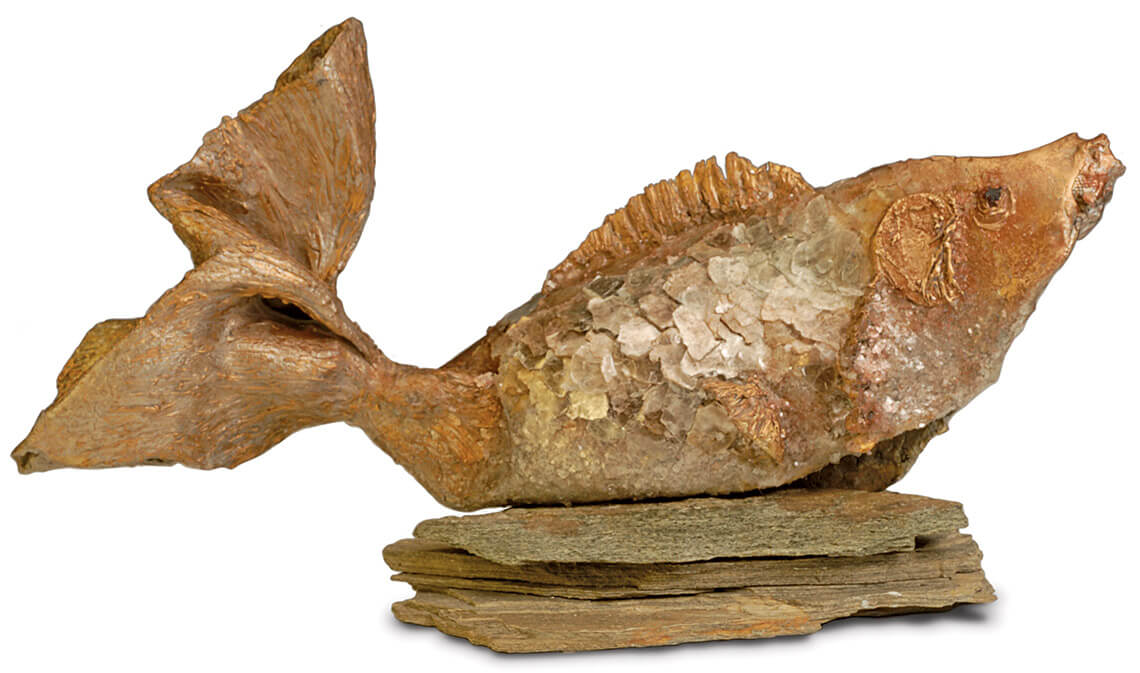 When Janice MacDonald took her grandson panning for minerals in the Spruce Pine Mining District during his summer vacation, the multimedia artist was drawn to mica, the glasslike material that North Carolinians have mined for more than a century. “After the trip, I went back in search of mica scraps,” she says. Scanning for crystals hidden among mud-covered pebbles in a black, rusty pan took gentle hands and a careful eye, but “the mineral was just so impressive, and I was able to bring a bucketful back home,” she says. Back in Morganton, she formed a six-foot piece of screen wire into the shape of a mountain trout and used a stretchy adhesive to apply the mica. “Mica is an important natural resource for this state,” she says. “To me, this piece reflects our history.”