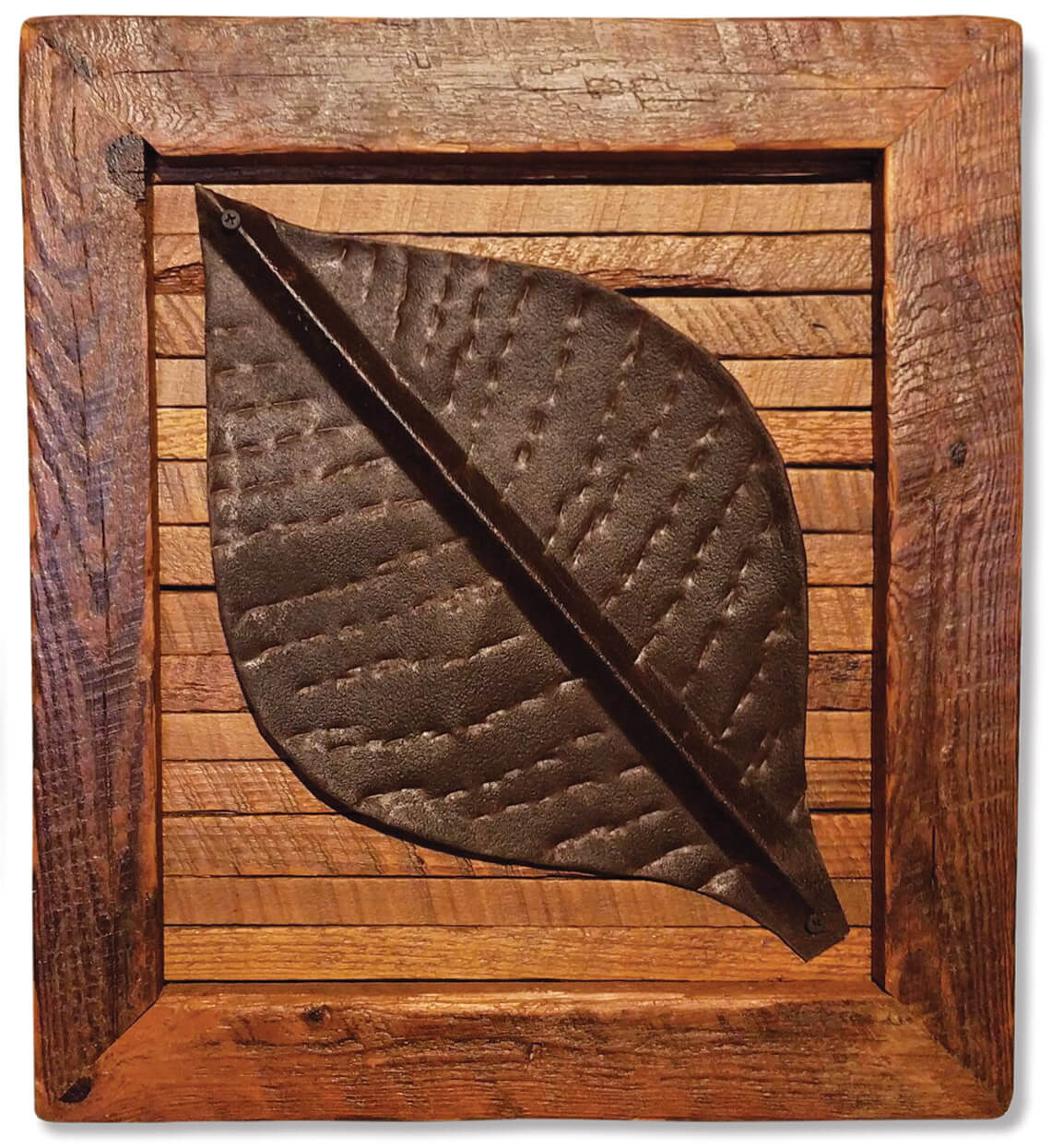 Whenever Kenneth Fuller notices a barn in bad shape, he pulls over and stops his truck. In what others might think of as valueless, he sees an opportunity to marry past and present. “When I see an old barn, I think about its history — how old it is, how hard somebody worked back in the day to construct it, and how useful it was to the family,” he says. The North Carolina native uses reclaimed wood from old barns in the Henderson area to make tables, mantels, cabinets, and more for his shop. His framed piece called “A Single Leaf” features a tobacco leaf made from vintage barn roof tin and a frame made from tobacco sticks. For Fuller, each piece he makes is symbolic of the tobacco community where he grew up during the late 1960s. “The pieces I make bring back memories of growing up on a farm,” he says, “and that’s a true piece of history worth preserving.”