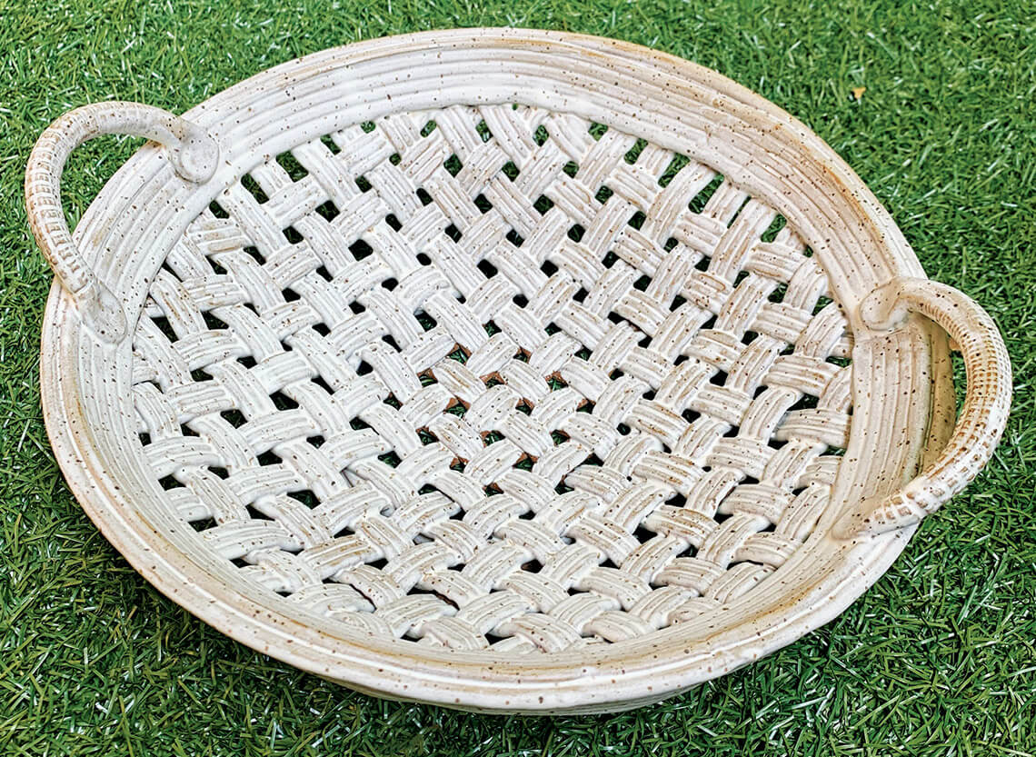 With its smooth, polished alabaster glaze, Margaret Wells’s pottery tempts anyone who sees it to hold it in their hands. Inspired by traditional basket weaving, the owner of Wiener Dog Pottery decided to approach the centuries-old art form with a different medium: clay. “I’ve always loved woven baskets,” she says. “North Carolina is so steeped in the craft of basket weaving, and I wanted to bring that work into pottery.” To form the clay into the 12-inch circular shape that she envisioned, Wells used a wok to create a plaster mold. After layering individual strips of scored and slipped clay on top of the pot-shaped mold, she couldn’t wait to add the finishing touch that would pull the piece together. “The clay/glaze combination is my favorite part of this piece,” she says. “It gives it an old-fashioned, rustic look that’s true to our state’s basket-weaving heritage.”