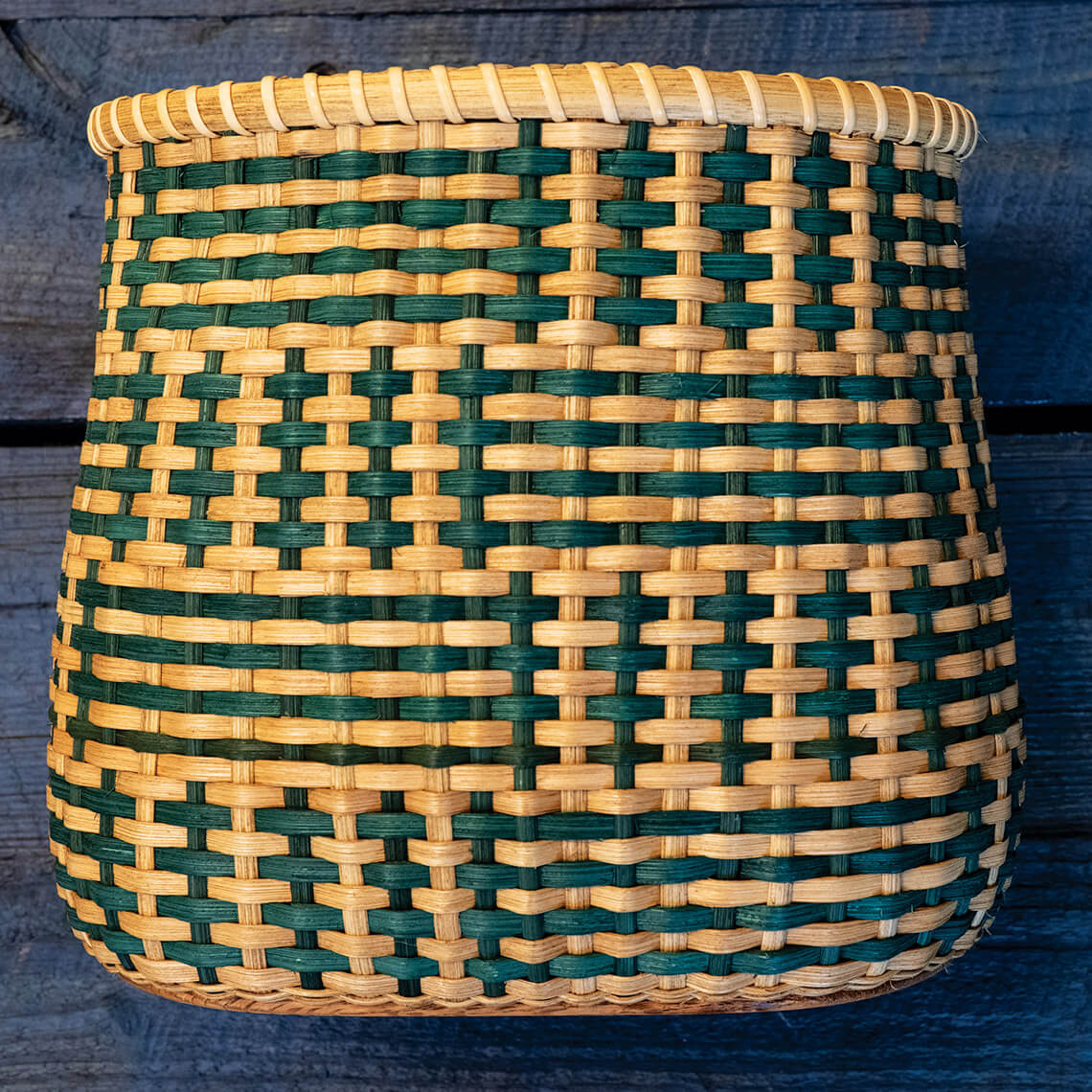 When Buncombe County artist Pat Holbrook took her first basket-weaving class, she didn’t expect to fall in love with one of North Carolina’s oldest and most treasured art forms. “I remember thinking to myself, I’ll never be able to do this,” she says. “By the end of the class, I was so excited that I could actually create [a small basket], and I’ve been making baskets ever since.” Around 2005, Holbrook decided to start her own business. She knew that she wanted to use her craft to showcase things she loved and memories she cherished, like an equestrian-themed basket inspired by her time riding horses as a child. Holbrook takes pride in crafting her own designs, including baskets accented with leather or braided handles, but she also enjoys modifying intricate patterns by other artists. To make her “Tartan Reed” basket — based on a pattern by designer Nancy Jones — Holbrook used wood for the base, and tan and green rattan reeds for the basket. “At first glance, people think the reeds are woven in different squares,” she says, “but it’s really just a fun optical illusion.”