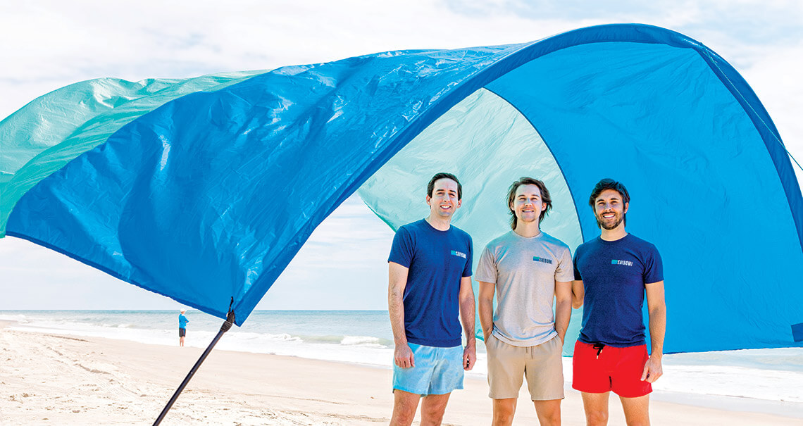 For many a summer, Dane and Scott Barnes and Alex Slater were drafted by their parents to set up unwieldy beach tents and umbrellas during family vacations to Emerald Isle, prompting the boys to begin pondering a better way. The trio eventually bought some PVC pipe, gleaned sewing tips from YouTube, and cobbled together an arch with a swath of fabric attached. They first beach-tested their contraption one windy summer night in 2015. “We turned on the flashlights on our cell phones, and the glow of that shade rippling against the sky felt electric,” Dane says. “I remember for the first time thinking, ‘Wow, this could actually work!’”