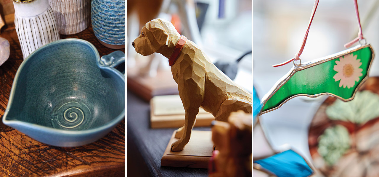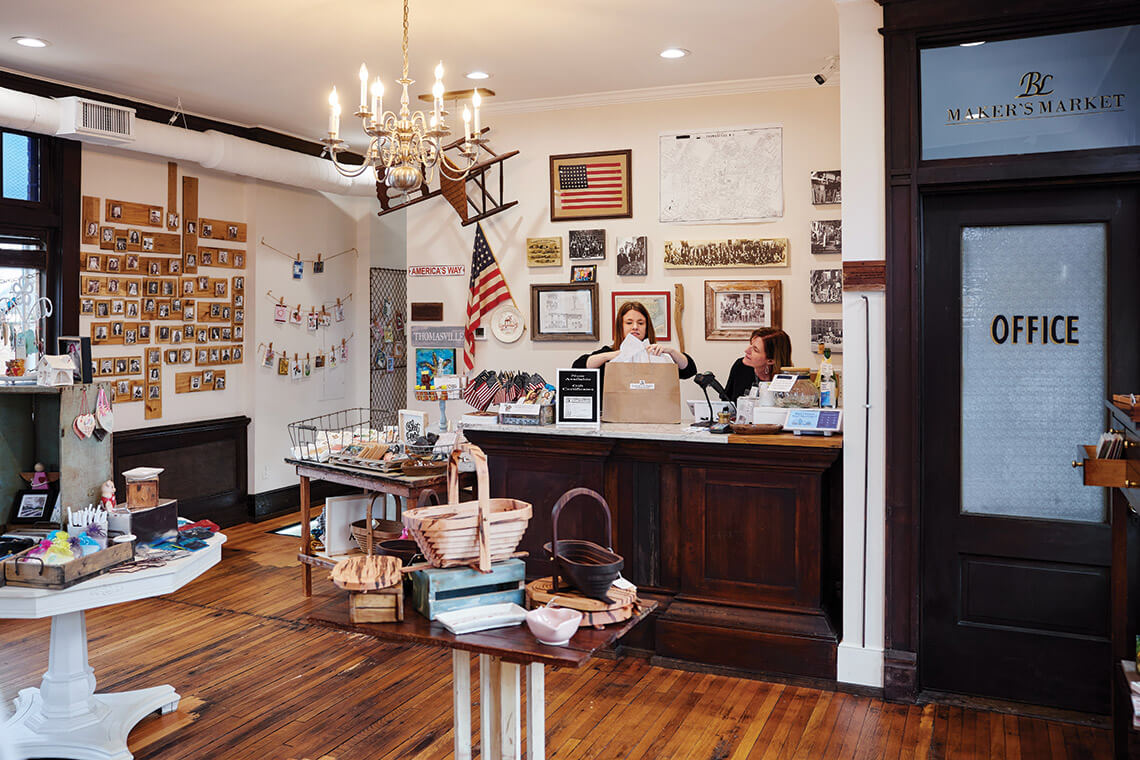Which is exactly what she did. In October 2020, at one of the worst times possible to start a new business, Blythe, a local leather artist and businesswoman, purchased the 3,000-square-foot building. Within seven months, she’d transformed it into BL Maker’s Market, a hub for handcrafted goods made wholly and exclusively in the USA. The market serves multiple purposes: It highlights the works of American artists and craftspeople, mostly from North Carolina; it provides opportunities for Blythe to partner with other small businesses; and it has rescued a local landmark from ruin.
