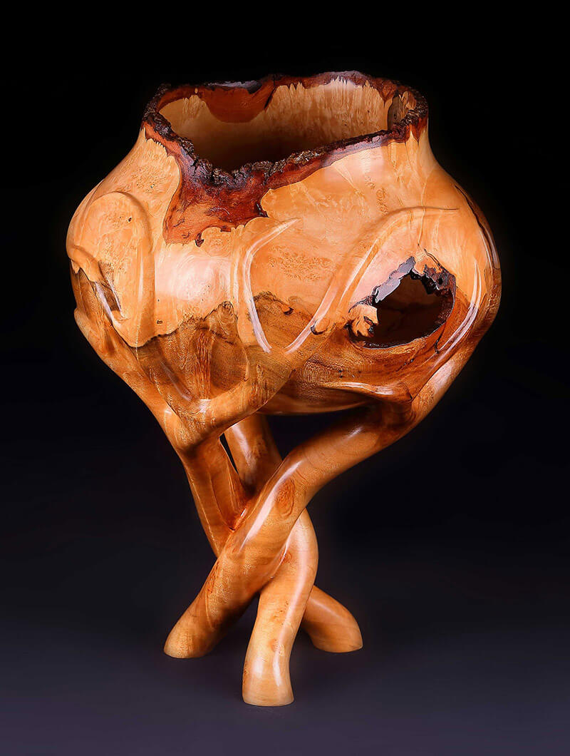 ★ Craft CategoryCarved Rhododendron Root Burl — “Mountain Shells” by Waldroup WoodworksThe Waldroups seek out wood with imperfections, such as burls and knots, and turn them into stunning and functional pieces. Made from locally salvaged or harvested wood from the mountains of western North Carolina, each piece of wood is chosen for its shape, color, and grain patterns. Using chain saws, a lathe, power grinders, hand chisels, and sanding techniques, the Waldroups strive to produce a finished piece with curves and shapes they see in the natural world. Honorable Mentions