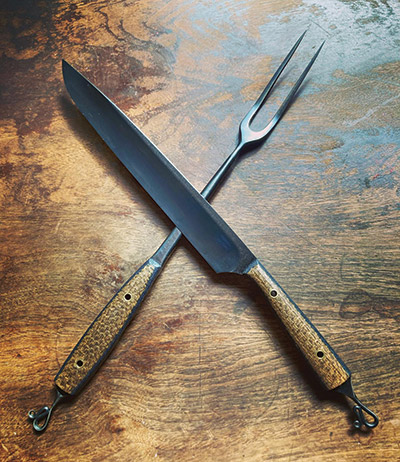 ★ Home & Garden CategoryLarge Grilling Set by Robinson Ex-Files KnivesRobinson Ex-Files Knives consists of a married team from Arden that creates quality kitchen cutlery and utensils from upcycled, locally sourced materials. The couple continues the rich tradition of rural Appalachian craft to create practical, durable, and beautiful pieces that will bring joy to your culinary adventures. The tools and blades are hand-ground from vintage files and rasps, and a wide variety of fabrics are transformed into vibrant and long-lasting handles for most of the culinary tools. Every Robinson Ex-Files Knife has been properly annealed to improve performance and durability. This Large Grilling Set incorporates a flat and half-round vintage file, and the handles feature a burlap coffee sack from Dynamite Roasting Co. burlap coffee sack layered over Wrangler denim and red canvas. Learn more about Robinson Ex-Files Knives. Honorable Mentions