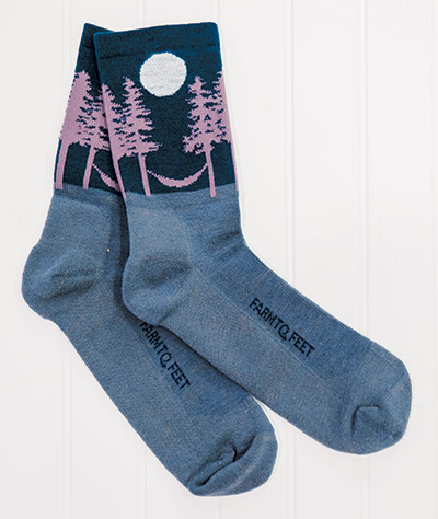 ★ Style CategoryAsheville — Outdoor Community Series by Farm to Feet, A Nester Hosiery BrandFarm to Feet, a Mount-Airy based company founded in 2013, has grown to be one of the leading sock makers in the country through a blend of novel design and technical innovation. Farm to Feet uses U.S.-sourced merino wool and works with many North Carolina-based vendors, including yarns from Burlington and Rutherford College, yarn spinning in Raeford, dyeing in Belmont and Valdese, and elastic from Madison to make its socks. In celebration of its 10th anniversary, Farm to Feet partnered with another leading North Carolina outdoor brand, ENO Hammocks, to create a commemorative design. Named for ENO’s hometown, the three-quarter crew Asheville sock has light cushioning and a comfort compression fit. The Asheville features an ENO hammock hanging between two pines with a bright sun or full moon shining above, depending on the colorway. Proceeds from the Asheville sock benefit Friends of the Mountains-to-Sea Trail. Learn more about Farm to Feet. Honorable Mentions