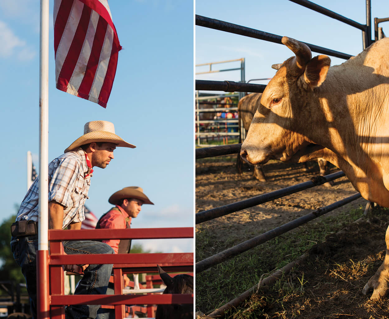 A typical night at the rodeo might include eight to 10 events, each designed to showcase riders’ skill in roping, wrestling, racing, and more. All of the events are exciting, but perhaps none more so than the bull riding, for which Brandon Presnell (opposite) has earned a champion belt buckle. photograph by Jack Sorokin
