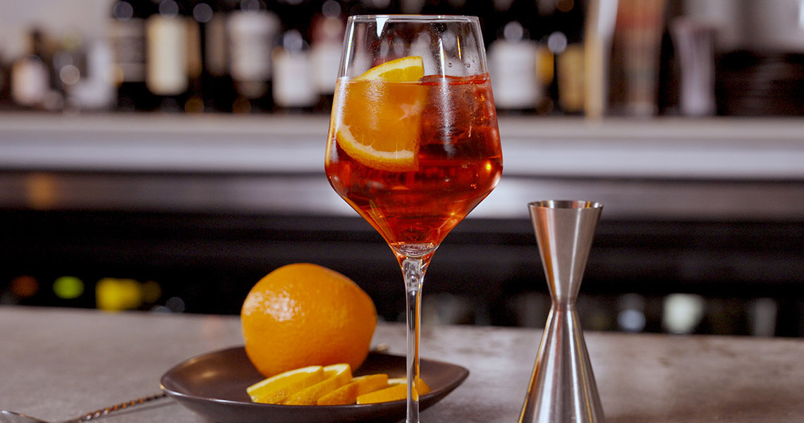 Mix Free Spirits Spirit of Milano, alcohol-free sparkling wine, club soda, and a small amount of ice in a wine glass. Garnish with an orange slice.