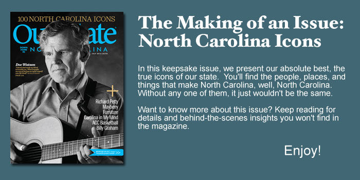 For the better part of a year now, we’ve been asking ourselves, “What makes North Carolina unique?” “What makes our state unlike any other?” We put those questions to you, our readers, via our Facebook page. We asked them of our writers. We asked them of our photographers. The answers to those questions made our list of 100 North Carolina Icons. And in this issue, we share them with you on a special pull-out keepsake poster.