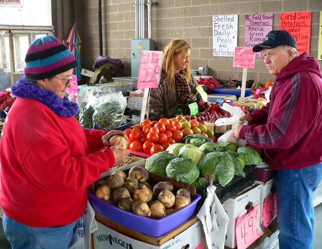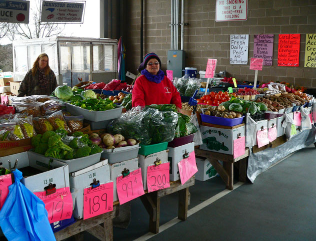 The Linda Johnson Family Produce booth has been in their corner location for many years. They’re there throughout the year, on the hottest of days and the coldest of days, happy and willing to help their customers. My friend Barbara (left) and one of her helpers (center) helped my brother (right) and me pick out fresh vegetables on our visit during one of the last days of winter. It was pretty cold, but we enjoyed lots of great stories about the market from Barbara and talking with her about farming in general. photograph by Steve Gordon