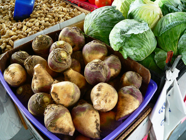 During winter, you’ll find all kinds of greens available. These rutabagas Barbara had for sale just kind of caught my attention as something “different.” They are a cross between turnips and cabbage. photograph by Steve Gordon
