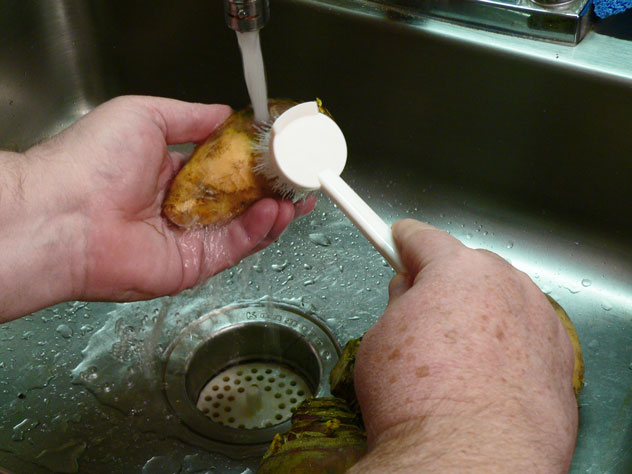 Even if I’m going to peel them, I like to wash all my vegetables prior to using them. For the rutabagas, scrub them under some cold running water to remove any dirt that might still be hanging on to them. They are a root vegetable and are generally pretty clean when purchased, but I still like to give them a good cleaning. photograph by Steve Gordon