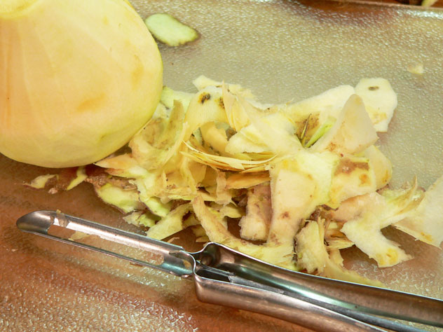 You could use a sharp paring knife to peel away the skin, or a good vegetable peeler works really well. Just use caution, take your time, and you’ll be ready to get cooking in no time. photograph by Steve Gordon