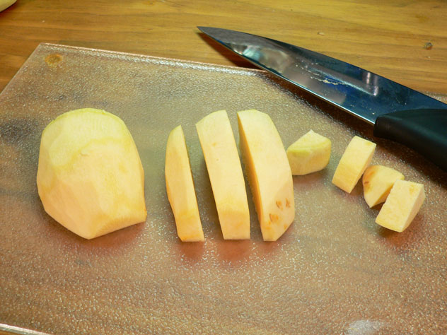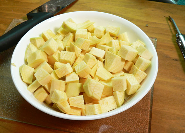 By cutting the ends off, you have a flat smooth surface to help stabilize the vegetable while you slice it. I stand mine up on end, slice it in sections, then cut those sections into cubes. photograph by Steve Gordon