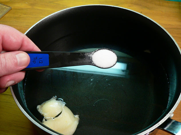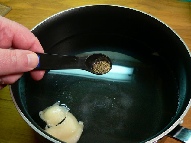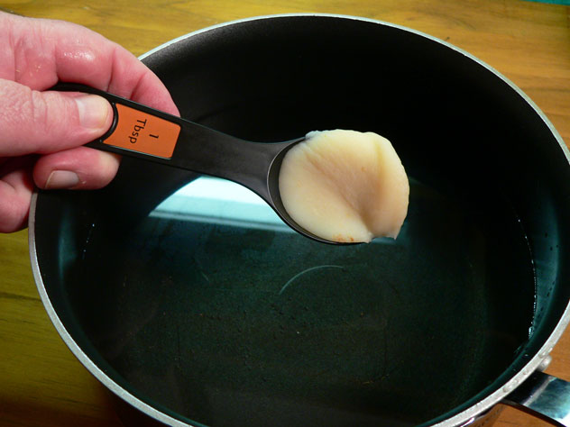 Add some cold water to a medium size sauce pot. Then, add the bacon grease. photograph by Steve Gordon