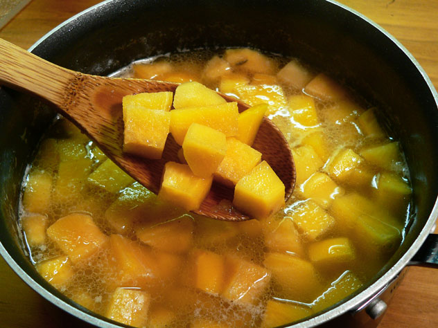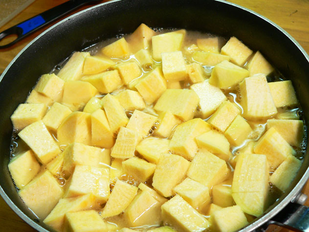 Add the diced rutabagas. You need just enough water to slightly cover them. Place the pot over medium-high heat and bring to a slight boil. Cover the pot, then reduce the heat to just a notch or two below medium heat. photograph by Steve Gordon