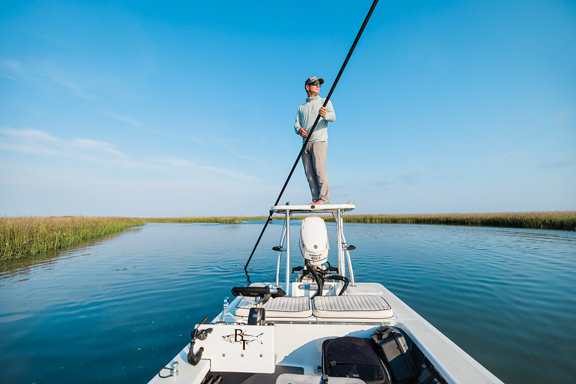 Vernon’s boat, a technical poling skiff, is light, agile, and custom-designed to silently and stealthily pursue shallow-water game fish. photograph by Matt Ray Photography