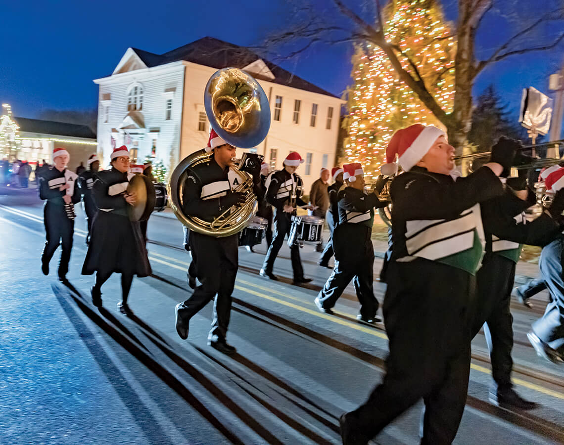 Every year, children pull the Yule Log through town on a special sled, escorted by marching bands like the one from Gastonia’s Ashbrook High School (above) and anyone else who wants to join. The parade route ends at Legacy Park, where the log is burned. photographs by Charles Harris