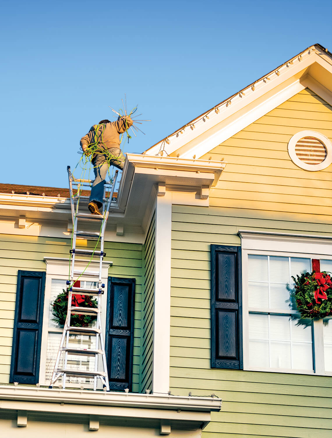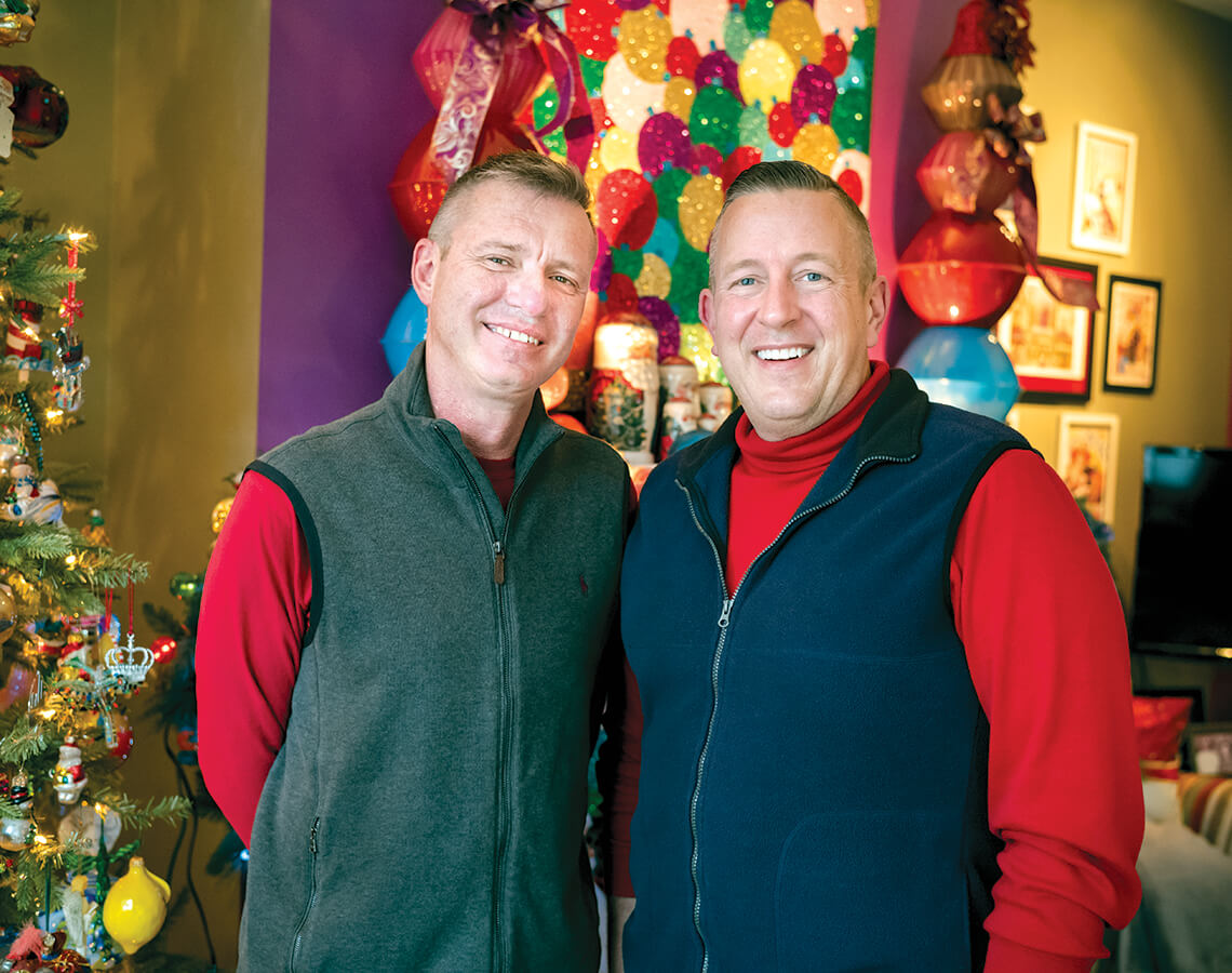 Last year, Kalis Egolf (below, left) and Todd Dickerson trimmed their home (above) like a giant tree — with ornaments of all sizes. photograph by Charles Harris