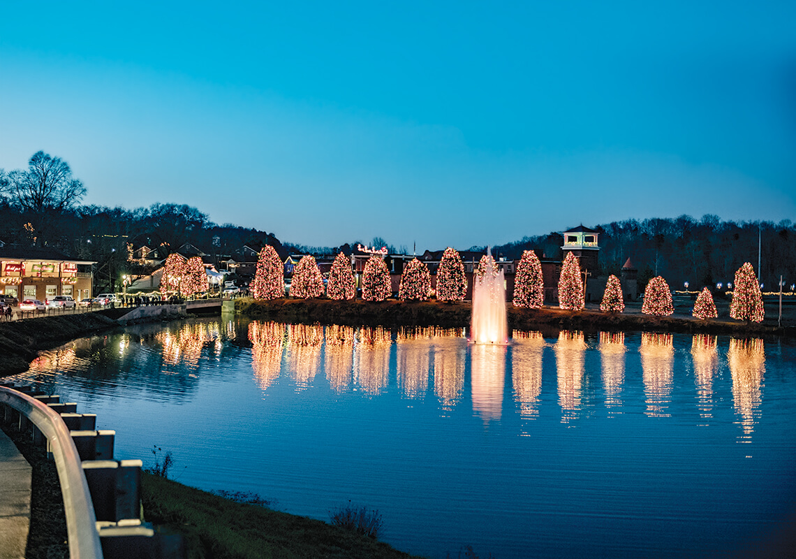 The displays might be smaller this year, but Tim Gibson (above) will work to make the town look perfect. The trees around the lake (below) won’t be lit, but this view remains one of McAdenville’s most iconic. photograph by Charles Harris
