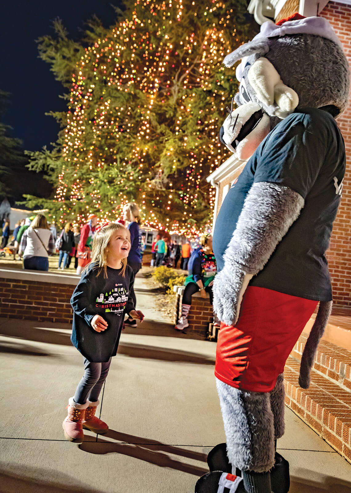 Even a heavy downpour last year couldn’t dampen the spirits of costumed runners in the Christmas Town 5K (above). Before the rain, McAdenville Elementary’s wildcat mascot made the rounds (below). photograph by Charles Harris