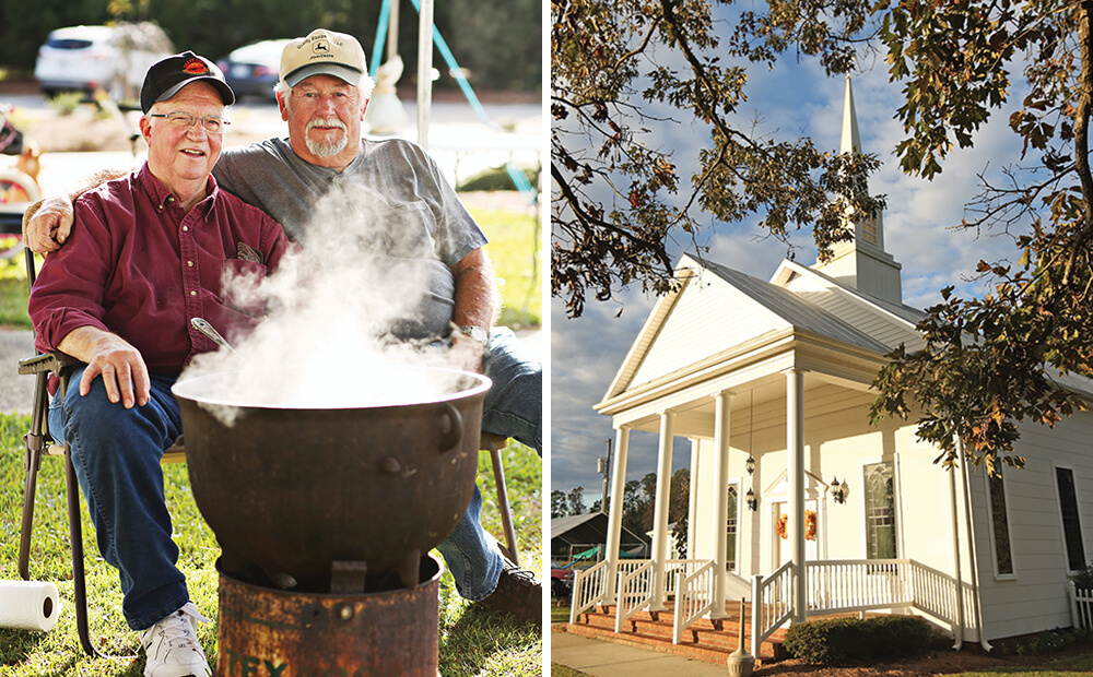 Every fall, cousins Francis Swinson (left) and Horace King Jr. watch the stewpot in the parking lot of Pleasant Hill Christian Church (opposite). Photographs by Juli Leonard