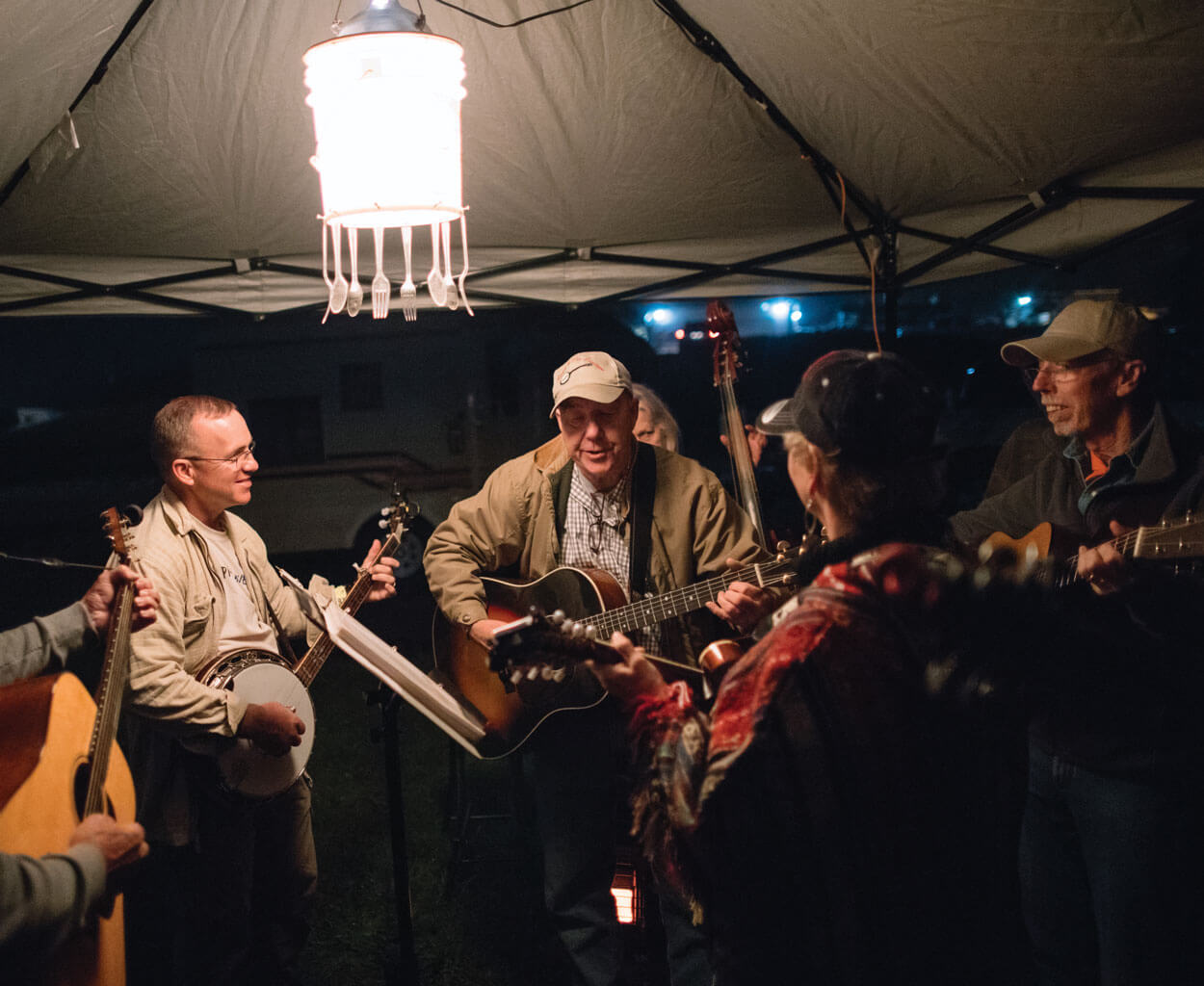 A group of SewerFest campers huddles under a tent for a late-night picking session. The Wilkesboro Wastewater Treatment Plant opened in 1998 as a festival campground, quickly earning an odorous nickname. Still, it’s one of the most happening places in town during MerleFest. photograph by Revival Creatives