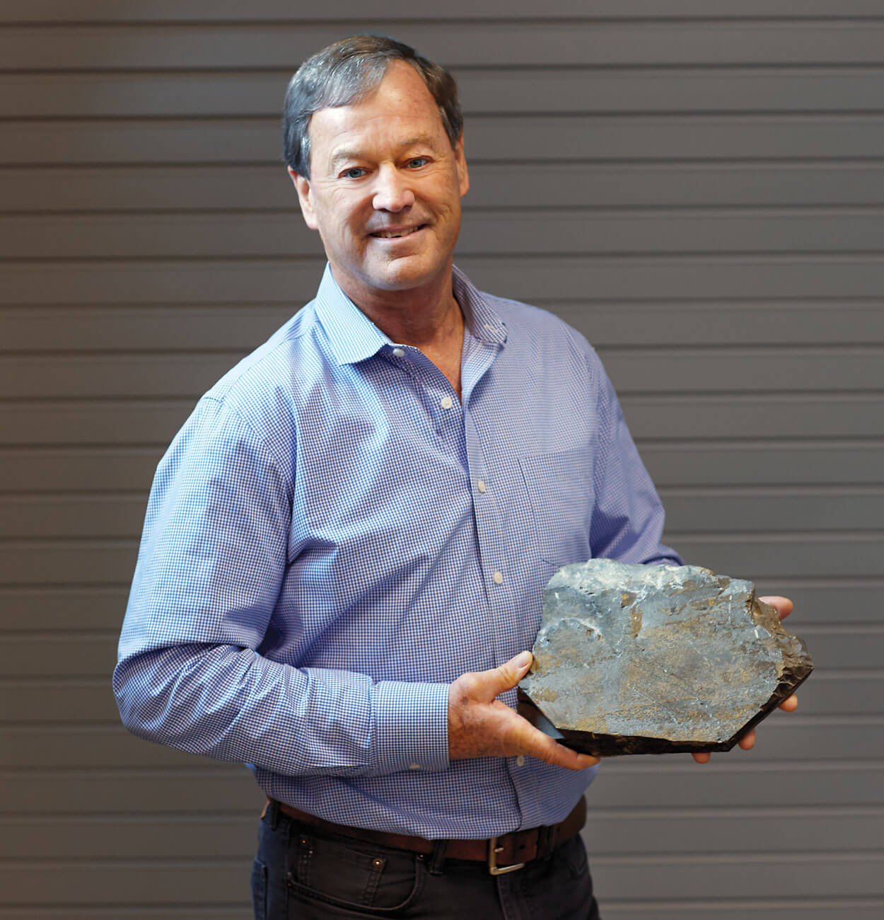 John Fisher toured the Barringer Mine in 1998 to find out if it would be worth his effort to reopen it. He left with a souvenir: a hunk of rock speckled with gold. photograph by Stacey Van Berkel