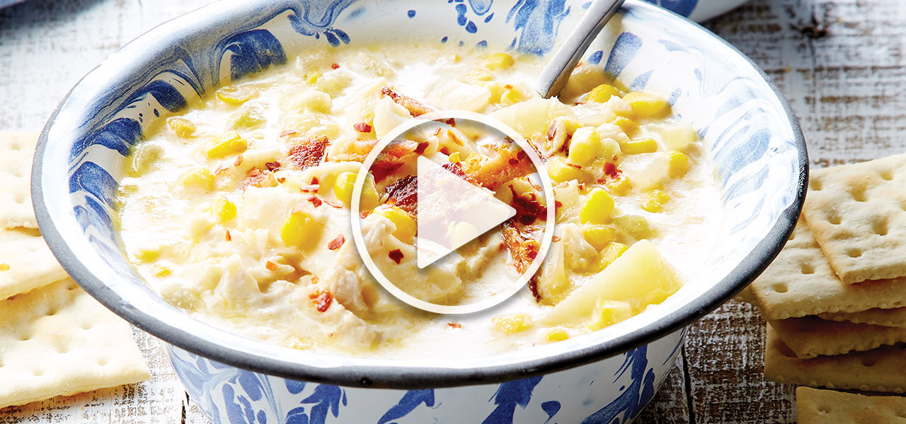 This creamy summer chowder is chock-full of corn, white fish, potatoes, and bacon.