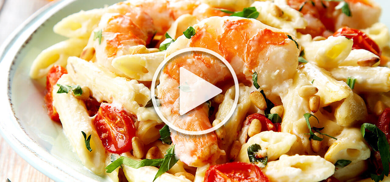 Tender shrimp, vibrant veggies, and penne pasta come together in this super creamy seafood supper.