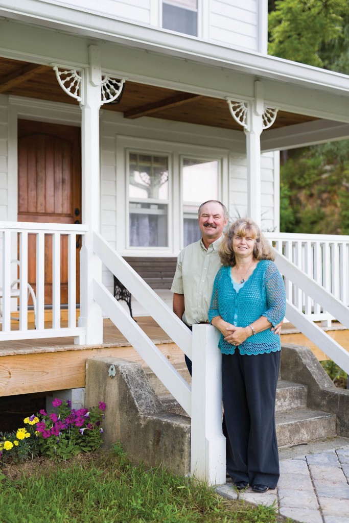 Because, wherever he could, Jackie refitted or reused materials from the old house for the restored version. Trim around every door and window came from wood already present in the older house. (In its evolution from log cabin to clapboard farmhouse, the structure likely underwent three “periods,” in architecture-speak, of construction: the 1830s, 1880 to 1910, and 1920 to 1940.) The five downstairs windows are in their original positions, with original — and permanently wavy — glass panes from the 1870s. The front porch is new, but constructed faithfully to what it would have looked like, and its ceiling is the original unpainted beadboard and gingerbread trim from what Cindy affectionately calls “Granny’s room,” which was upstairs.