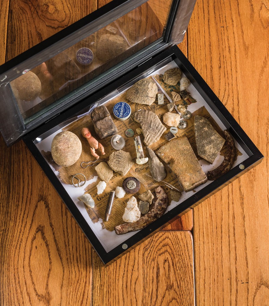 A box of totems from owners past reveals a doll, a bullet casing, and an ax head. photograph by John MacLean