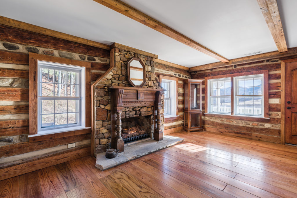 This stone fireplace, and the log cabin walls, are original. Two more chimneys were added to the house later in its life. photograph by John MacLean