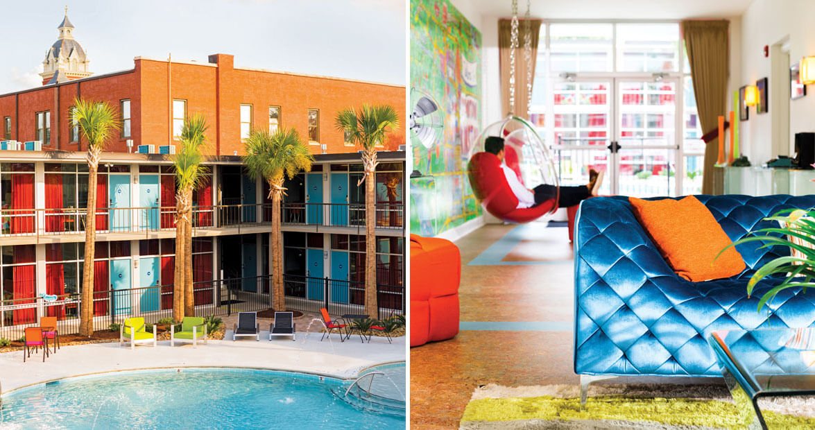 With the decline of the textile and tobacco industries that drove the town’s economy, the motor lodge fell on hard times. But in 2012, Stephen Hill, the local entrepreneur and patron of the arts who owns Mother Earth Brewing Company, bought the motel and restored it to its former glory — and then some: 45 rooms and suites, all colorfully decorated with original artwork on the walls, retro chairs, and polka-dot bedspreads. The three-ring pool (reminiscent of the kidney-shaped pools of yesteryear) is surrounded by palm trees and freshened by five fountains. Behind the pool is a play area with grilling stations, picnic tables, shuffleboard, Ping-Pong, and a miniature golf course.