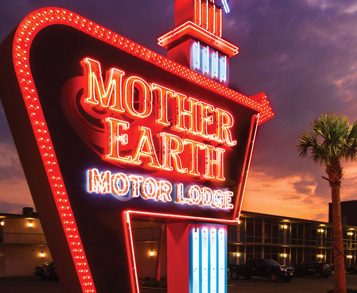 That’s how my wife, Jill, and I feel as we pull into Mother Earth Motor Lodge in Kinston one sunny afternoon, after driving past miles of farms and fields and slowing for a few small, quiet towns straddling the highway. Then, suddenly, civilization: a lighted sign and the motor lodge, bright and sharp, all straight lines and bold colors, the doors just a shade darker than the Wedgwood blue of my family’s ’59 Ford.