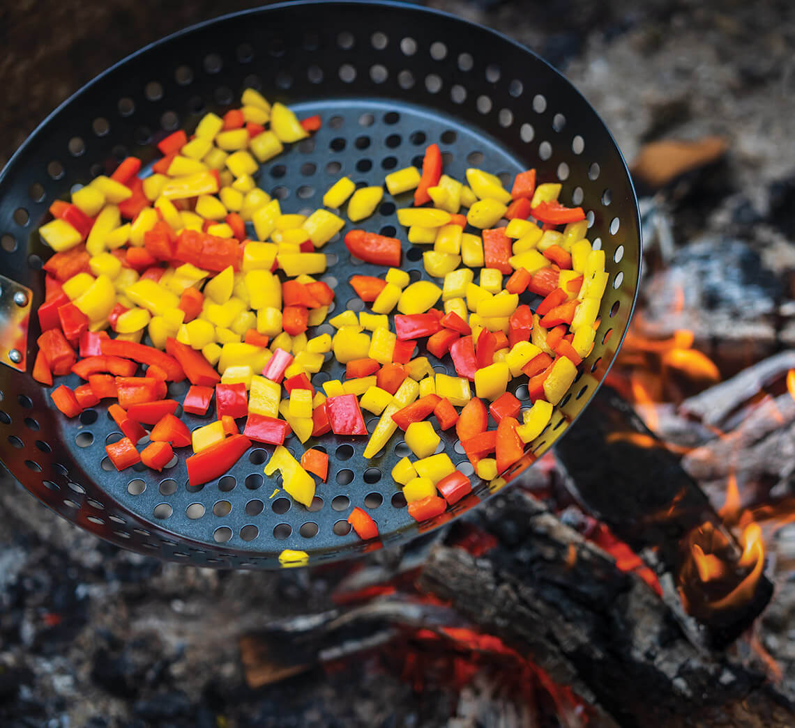 Lisa preps red and yellow bell peppers at home before cooking them over the campfire for her Buddha Bowls, named for a dish at a favorite restaurant. photograph by Thomas Moors