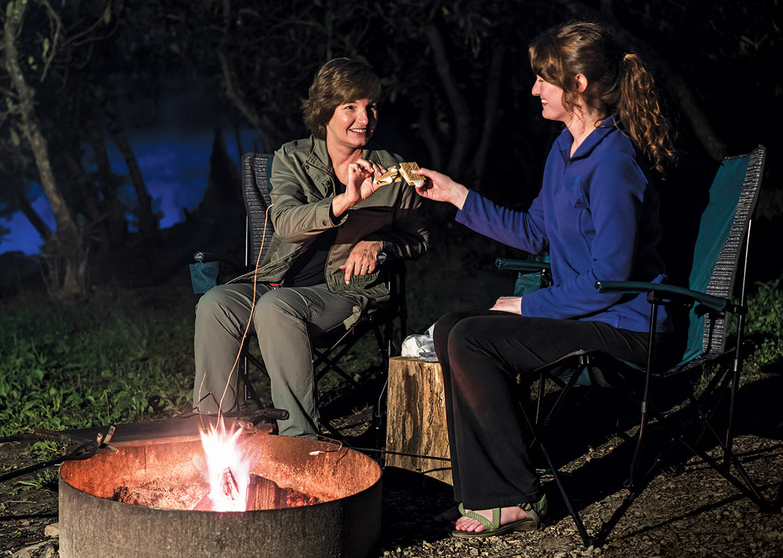 One of the pair’s favorite campsite rituals is making s’mores over a flickering fire, and saying “cheers” when the classic treats are ready to eat. photograph by Thomas Moors
