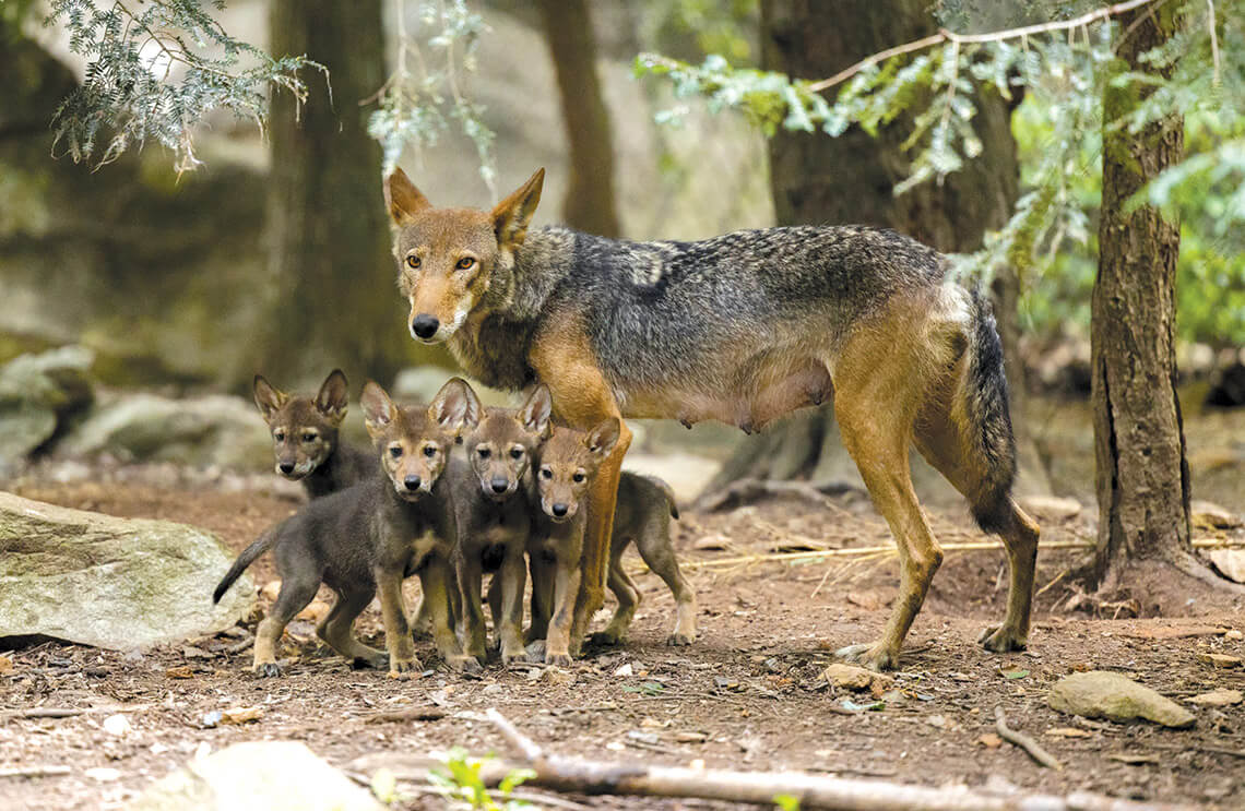 Eno and Harper, two of the North Carolina Zoo’s 32 red wolves, often put on a show for their mom, Sassafras. The siblings wrestle and tumble through their enclosure, jumping over boulders and pine branches. Although they look as big as their mother, Eno and Harper were born in April 2021. The pups, now juveniles, are part of a litter of six — two males and four females. Through a poll, fans voted to name the remaining pups Warrior, Fisher, Pearl, and Catawba. Red wolf packs usually consist of a lifelong mated pair and a few of their pups. Family units remain close, and Sassafras’s litter is no exception: Mom stays busy teaching her pups how to stalk their littermate and establish their own territories.