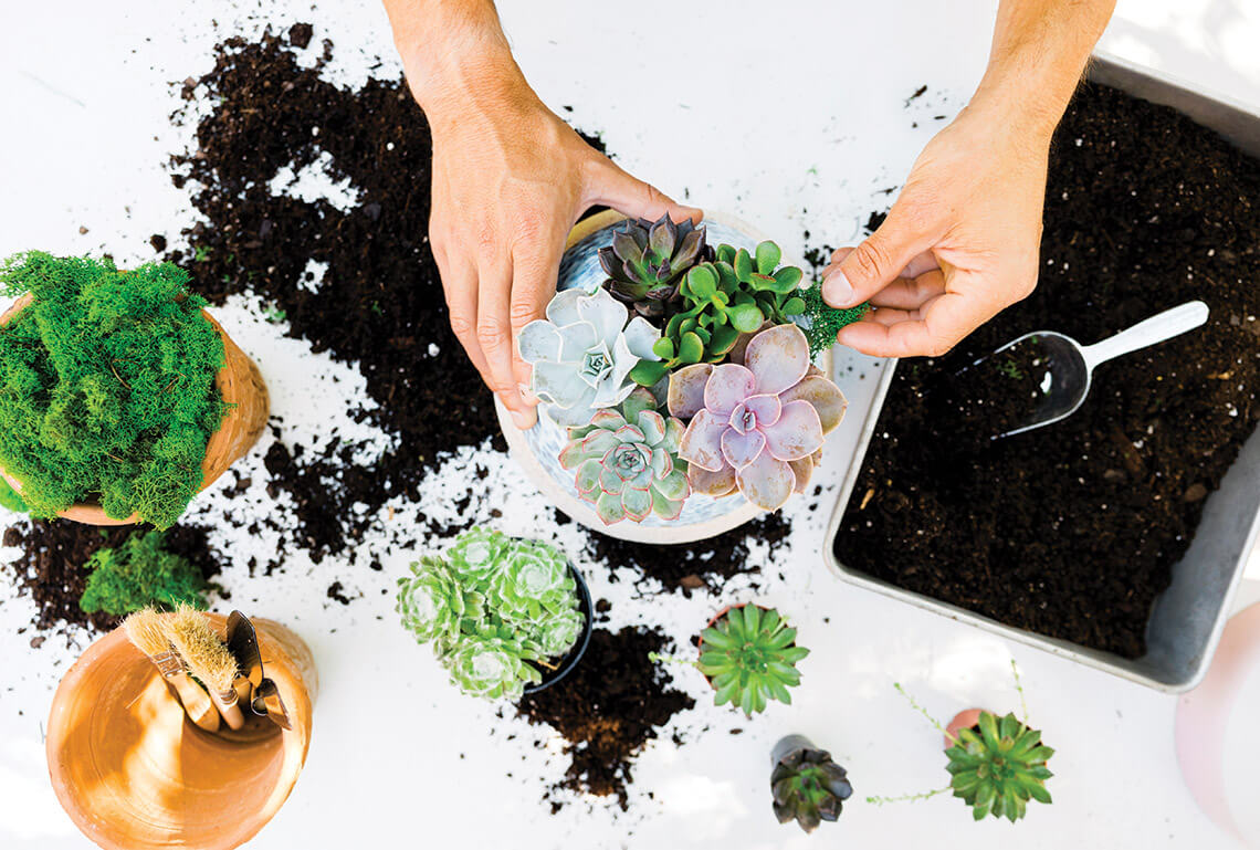 Brandon McKeown tucks a jade plant among Echeveria succulents in a ceramic pot to create a colorful arrangement. photograph by Matt Ray Photography
