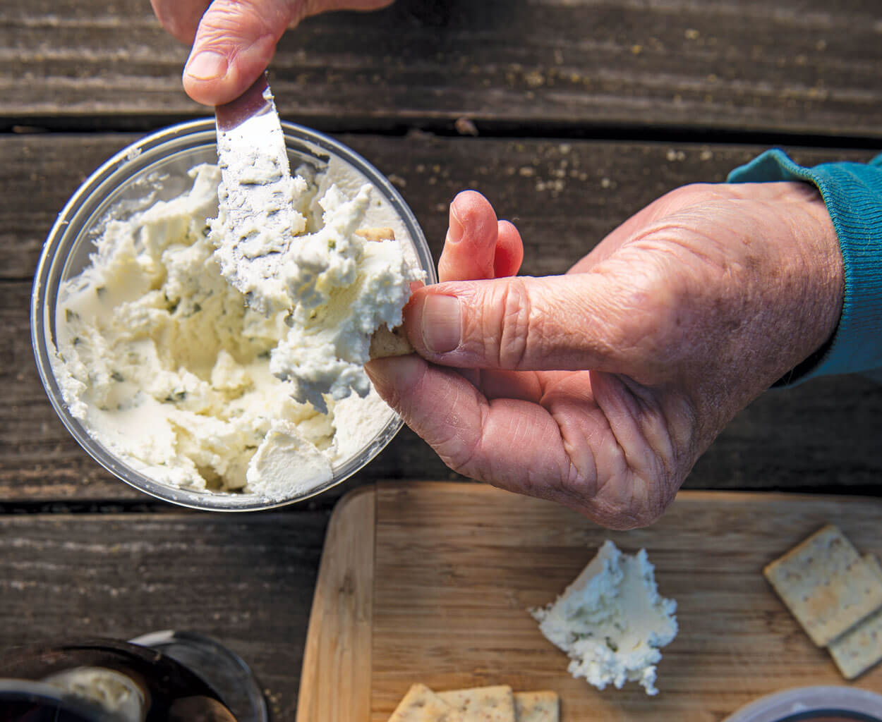 Jackie Palmer doesn’t just make chèvre; she’s also a huge fan. “You can mix anything you like into the plain cheese — herbs, nuts, fruit — but my very favorite mix is fresh, raw garlic and chives. That’s the only mix I make,” she says. photograph by Jack Sorokin