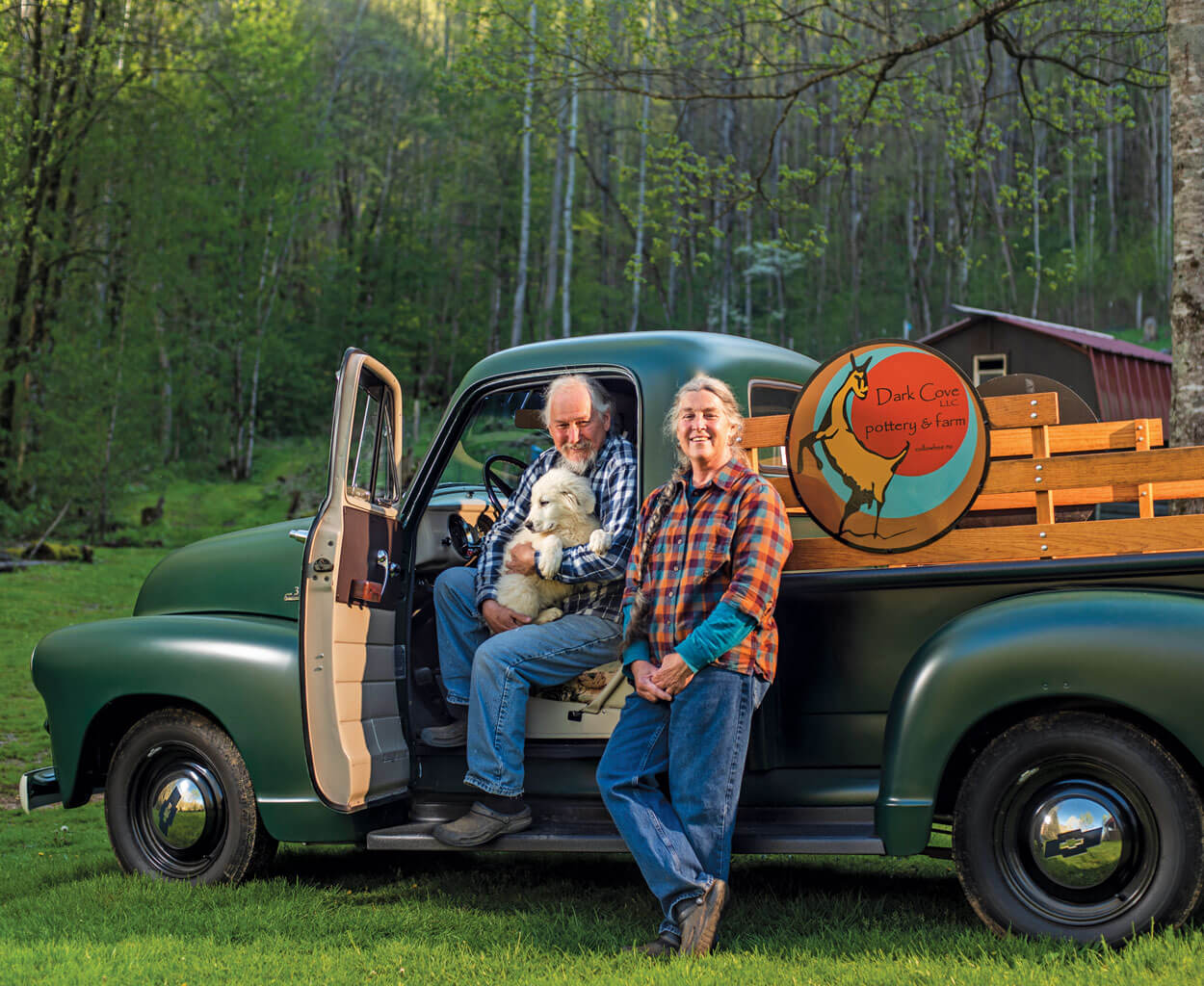 Jackie Palmer and David Smith have a trusty assistant in their Great Pyrenees puppy, Avalanche, and a trusty 1954 Chevrolet pickup — named Rosie — which you can spy at the Jackson County Farmers Market in Sylva. photograph by Jack Sorokin