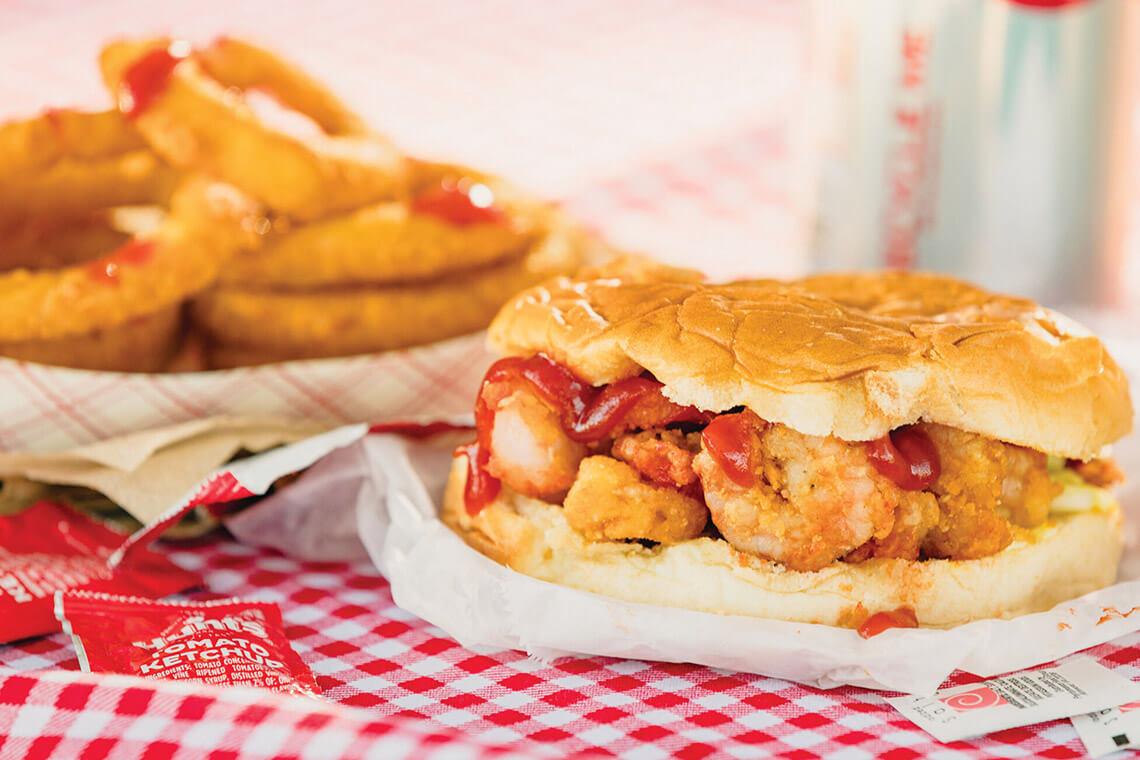 In Morehead City, El’s Drive-In serves a classic version of the shrimpburger (minus the tartar sauce). photograph by Baxter Miller