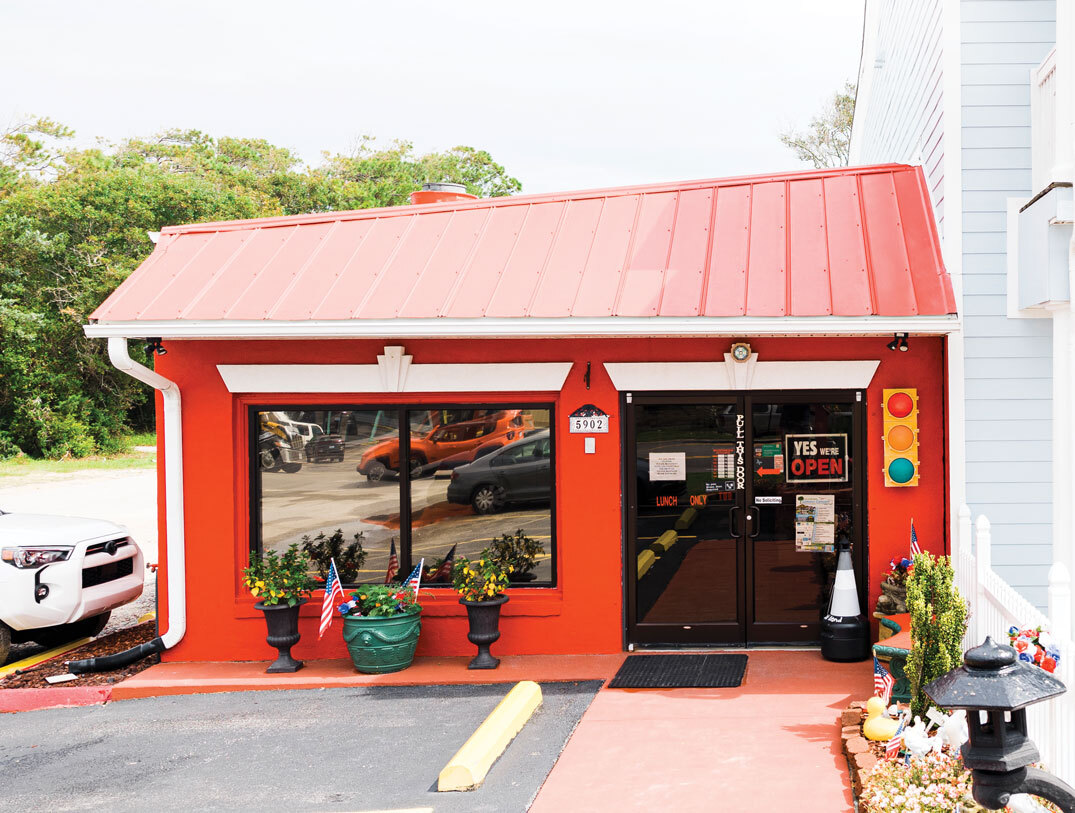 As long as the “Gone Fishing” sign isn’t up, Little Bit is behind the grill inside her bright red restaurant, feeding beachgoers, anglers, and Oak Island locals. photograph by Matt Ray Photography