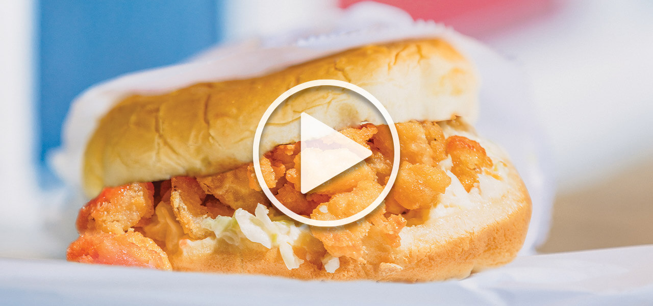 Fried shrimp, tartar sauce, slaw, and ketchup on a steamed bun — the shrimpburger is an icon of North Carolina.