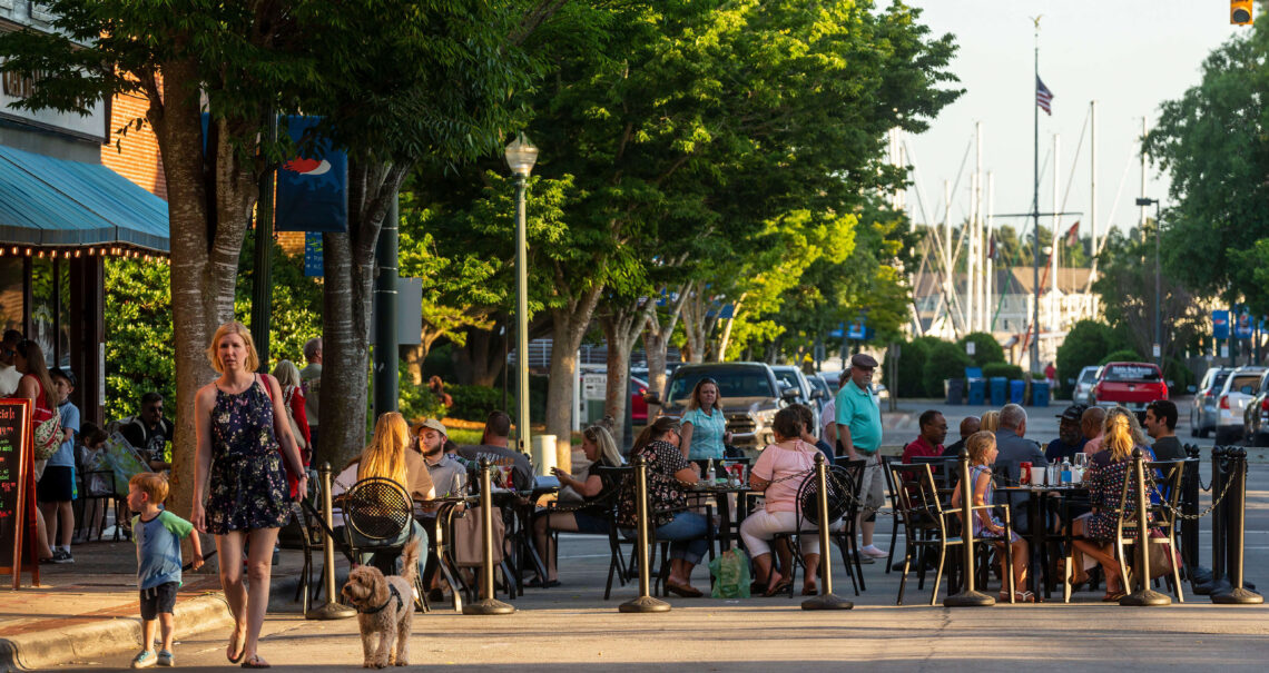 As the sun begins to set, New Bern’s “Beermuda Triangle” buzzes with locals and visitors exploring the walkable Pollock Street corridor — packed with historic buildings, shops, and restaurants.