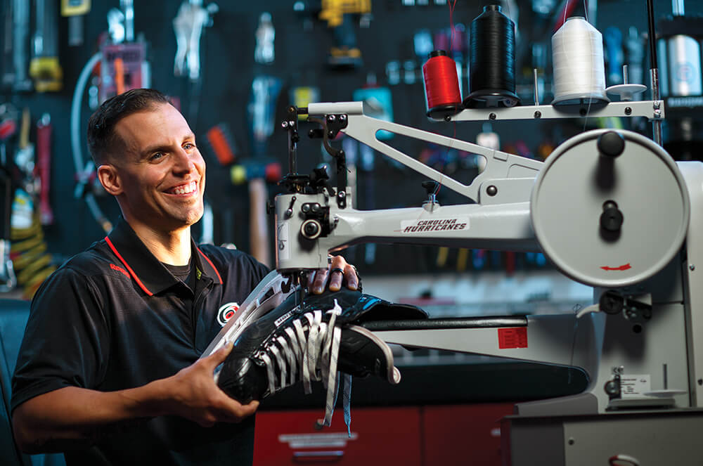 The Hurricanes made Jorge a full-time equipment manager in 2012. On game days in Raleigh, he can usually be found scurrying around the bowels of PNC Arena: Skates need to be sharpened. A strap needs to be fixed. A helmet needs adjusting. He knows which players sweat enough to need their gloves thrown in the dryer. He knows how players like their sticks prepared better than they do. He knows that longtime goalie Cam Ward superstitiously likes his water bottle placed in his glove before a game, not left on top of the net. “We’re all quirky,” says longtime player turned coach Rod Brind’Amour. “He’s not quirky.”