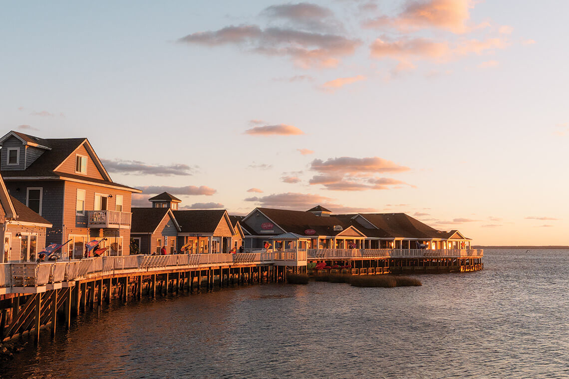 Soundside Boardwalk provides visitors easy access to Duck’s shops and restaurants while offering a panoramic view of Currituck Sound. In the soft light of dusk, customers make their last purchases and then follow the walkway — illuminated by 285 solar-powered lights — home.