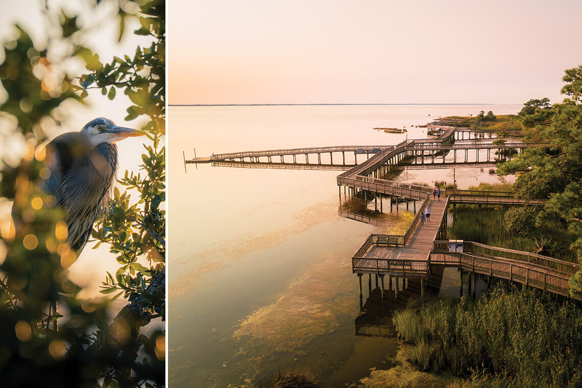 Near Duck Town Park, the boardwalk extends out into a kayak launch. While folks paddle along the glassy surface of Currituck Sound, a resident great blue heron (left) keeps watch. photograph by Chris Hannant