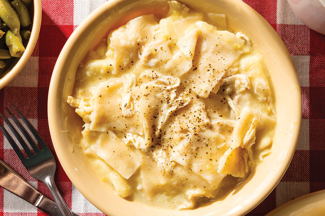 In eastern North Carolina, chicken and pastry — or, more fondly, chicken pastry — is a different take on dough. For this dish, rather than dropping dollops of dough, cooks roll out the flour mixture into thin, wide strips, which are then sliced into diamonds or rectangles. Mixed with tender, shredded chicken, the starchy stew can be found on menus at mainstays like King Chicken Drive-In in Washington and Ruth’s Kitchen in Wilmington.