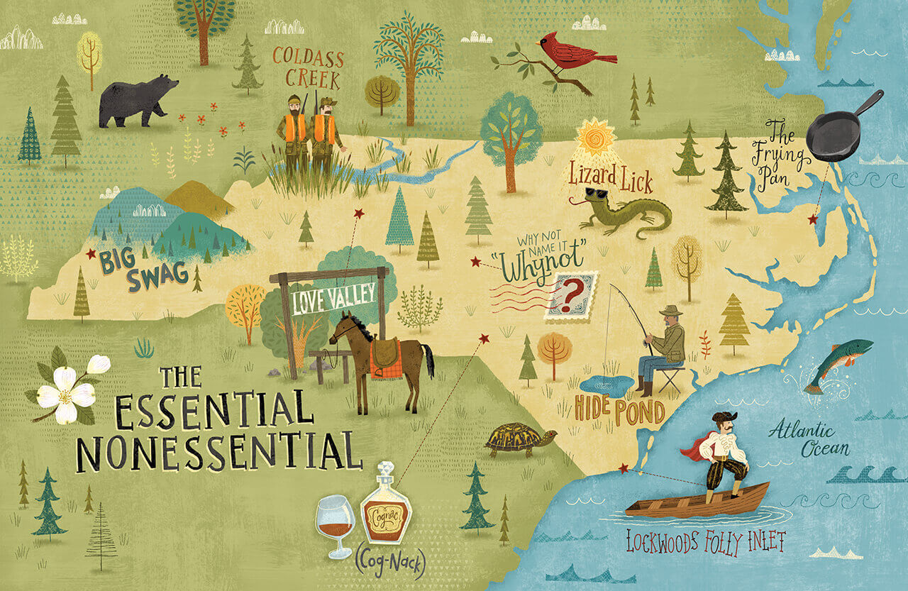 The Internet is here to stay. But what’s lost when I type “Coldass Creek” into a search box instead of bending to the lowest shelf on the white bookcase in the hallway where my Gazetteer resides is this: the ability to get as lost as those two Caldwell County hunters — one starving, one freezing, both bathed finally in the beauty of creation. Idly passing time with the Gazetteer makes me feel as if I’ve embarked on an adventure similarly characterized by ingenuity and humor. That sentence describes who we are as North Carolinians: ingenious storytellers of a slightly ironic bent. We might not all come from places with crazy names, but we’re all in this wonderful book. Together — just like the entries themselves — we add up to far more than the sum of our parts.